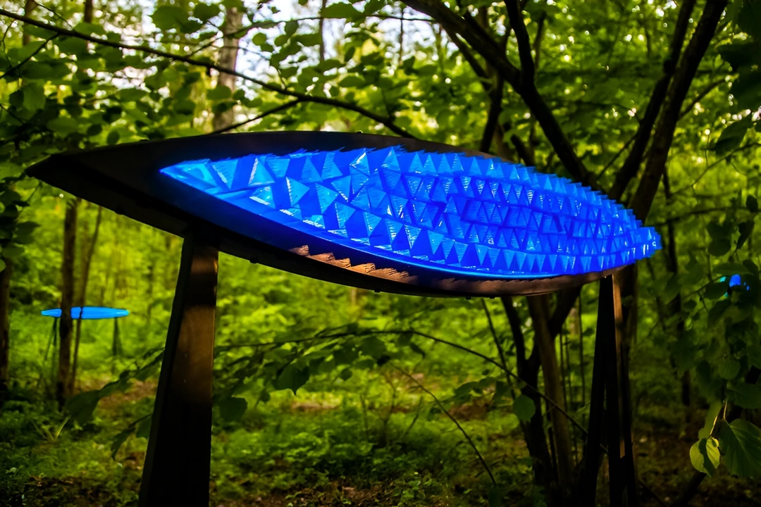 Трудно не обратить внимание и на эти светящиеся оптические объекты, созданные из тысяч стеклянных призм и установленные среди деревьев. Полураскрытые глаза на высоких ножках пристально всматриваются в посетителей парка.