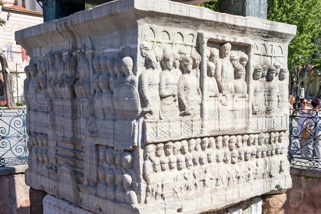 В столице Византийской империи памятник установили на новый мраморный постамент, украшенный барельефами с изображениями императора и сцен из жизни города. На одной из сторон высечен Феодосий, награждающий победителя гонок на колесницах, а на другой — момент установки обелиска.