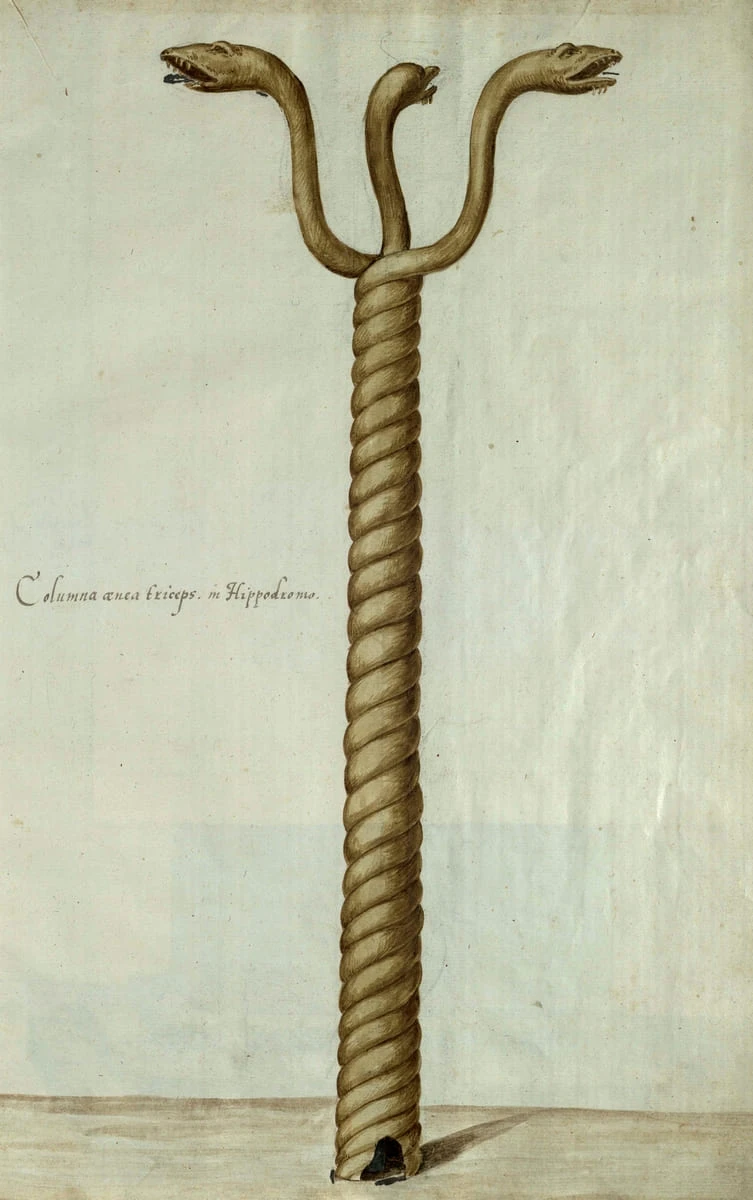 Змеиная колонна на площади Ипподром — самая упоминаемая в древней литературе из всех достопримечательностей площади. Информация о бронзовой конструкции встречается в трудах сразу нескольких писателей. Так, древнегреческий историк Геродот, рассказывая о колонне, отмечал, что для её изготовления использовали десятую часть трофейного оружия, которое собрали греки на поле боя после победы над персами.