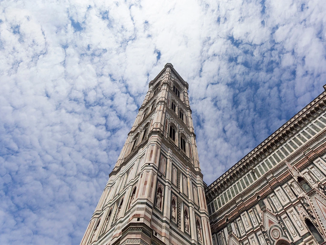 Каждый из ярусов 85‑метровой постройки Джотто — это отдельное произведение искусства: они украшены барельефами, изящными статуями и мраморными плитками трёх цветов. На колокольню можно подняться, в её верхней части есть смотровая площадка, к которой ведёт 414 ступеней.