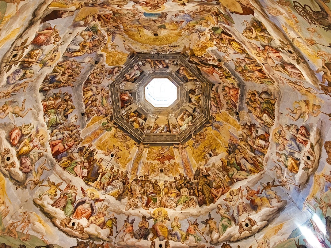 Обязательно советуем зайти внутрь — здесь есть на что посмотреть. Изнутри купол Санта‑Марии‑дель‑Фьоре расписан удивительно детальными фресками с изображениями Страшного суда. Они состоят из нескольких ярусов и занимают 3600 м², то есть примерно половину футбольного поля.