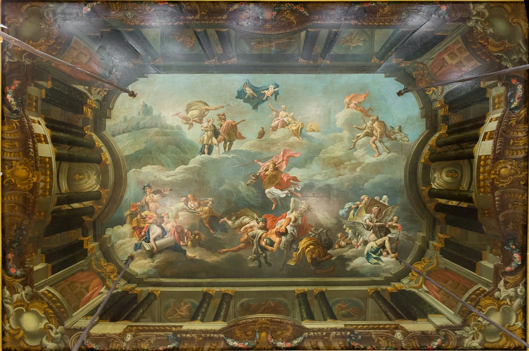 Первое, что привлекает здесь внимание, — великолепный плафон на потолке. Для его создания итальянский художник Джузеппе Валериани расписал 13 холстов, которые затем закрепили на потолке. В центре масштабной композиции — богиня мудрости Минерва, изгоняющая пороки, в окружении аллегорических фигур искусства и добродетелей.