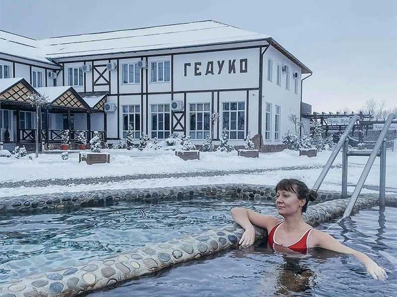 - «Двор №3» глубиной 1,2 м с массажем и горкой. Температура воды здесь 45°C.