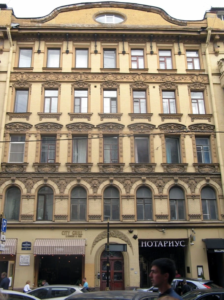 Памятник архитектуры стиля модерн построили в начале 1900‑х для известного ресторатора Павла Палкина. Фасад украшают арочные окна, флористические барельефы, изящные кованые решётки. А над центральным входом — маскарон с лицом задумчивой девы. Следы «прекрасной эпохи» остались и в парадной. Особенно впечатляют витражи с алыми цветами.