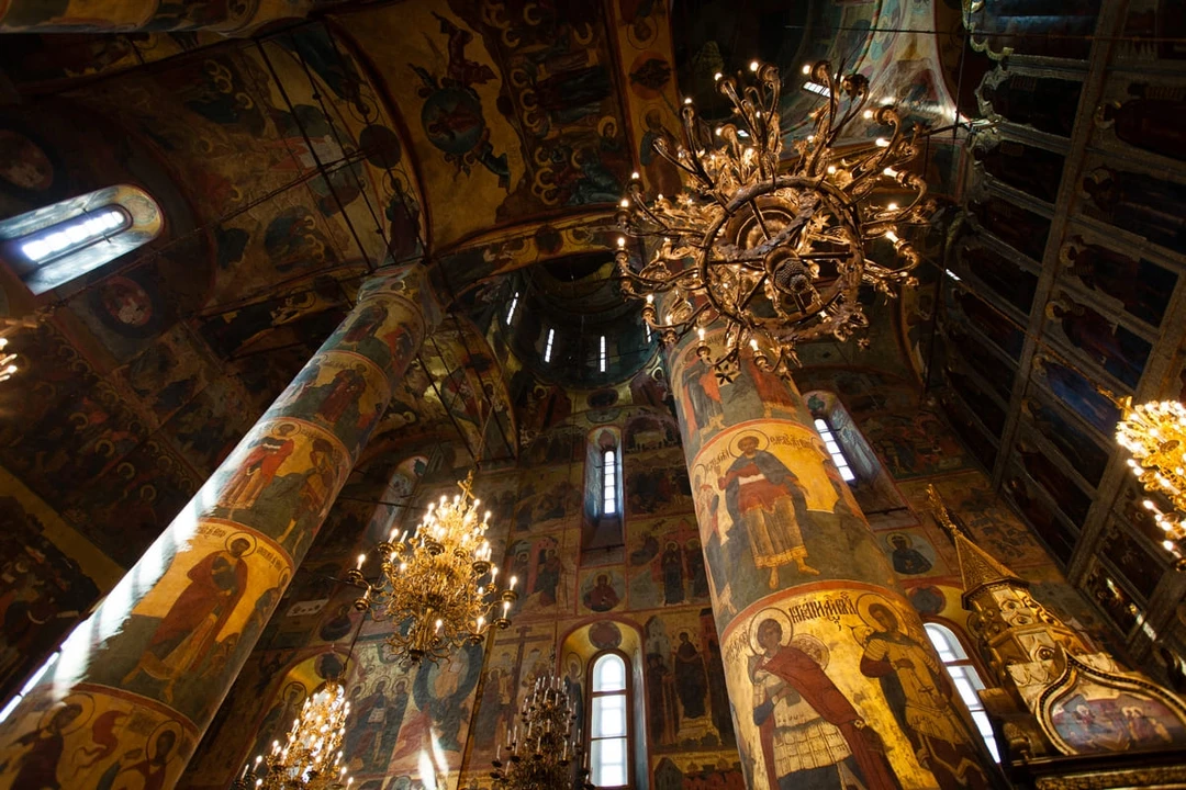 Если присмотреться к росписям, можно заметить, что они нанесены в определённом порядке. В пяти главах собора находятся образы Бога, наверху стен — сцены из Евангелия, а внизу — семь Вселенских соборов. На сводах изображены двунадесятые — 12 самых почитаемых христианских праздников, а на круглых колоннах — фигуры святых.