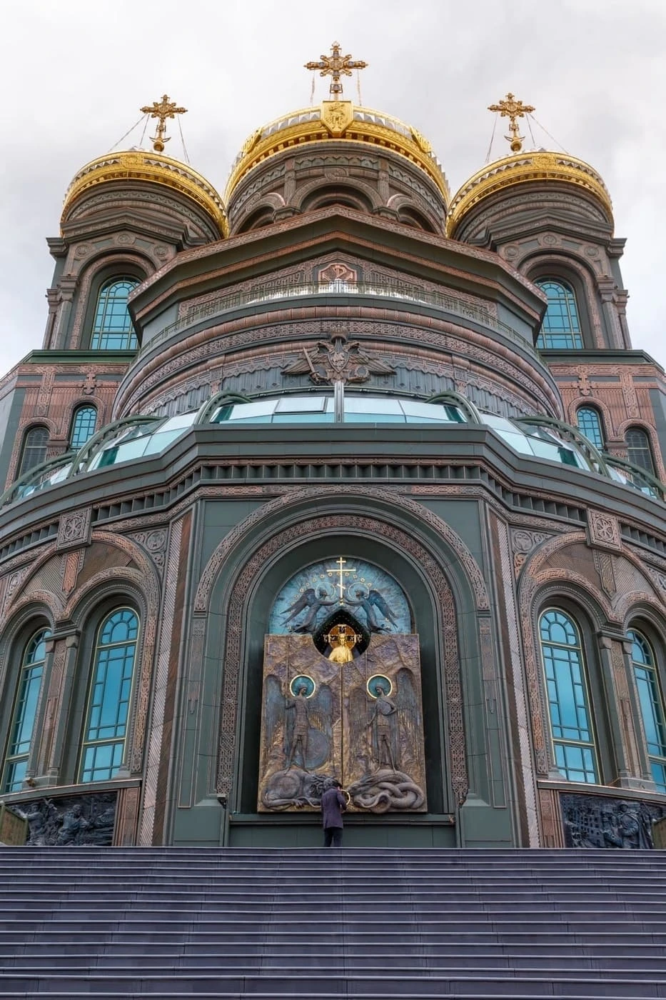 Даже ступени у входа в храм необычные — из чугуна с добавлением переплавленных обломков трофейного немецкого оружия, осколков мин, фрагментов гусениц танков. Доля этих элементов невелика, всего около 5%, но идея весомее цифр: война, пережитая и переплавленная, буквально легла в основание храма.