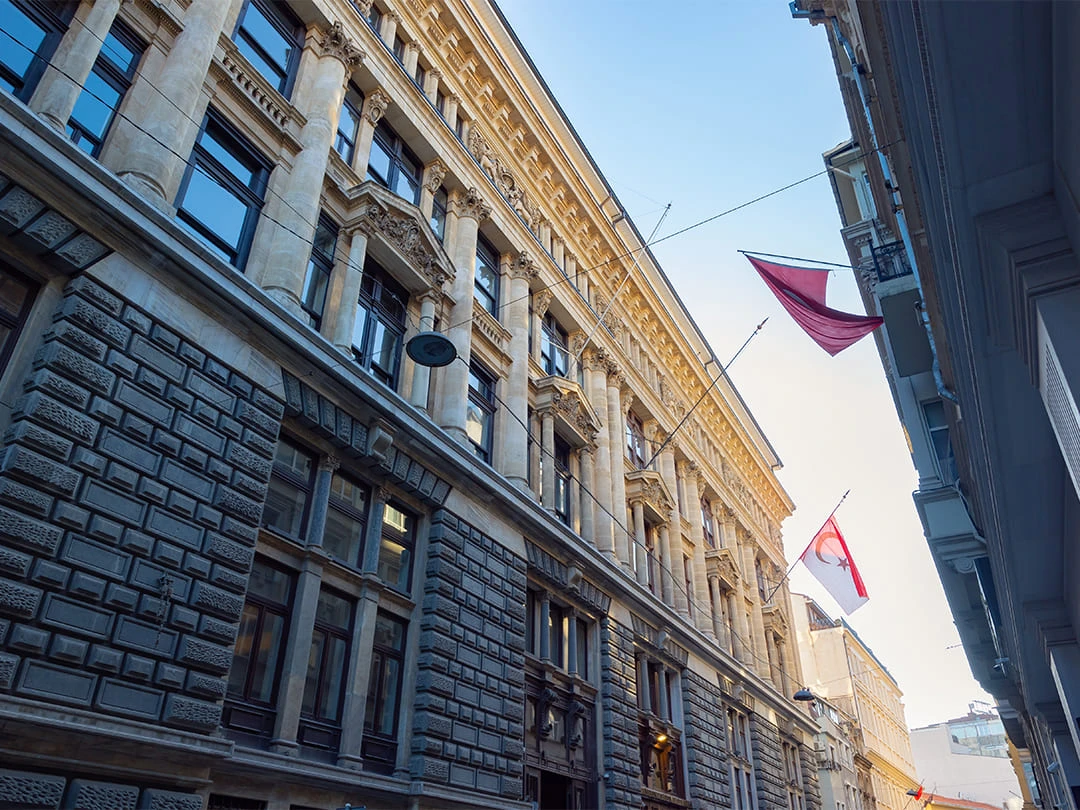 Он находится в здании бывшей штаб‑квартиры Османского банка — архитектурном памятнике конца XIX века. Один из фасадов постройки оформлен в неоренессансном стиле, а другой — в ориентальном. Эклектичный облик здания — не случайность. Постройка должна была напоминать, что деньги — связующее звено между Западом и Востоком.